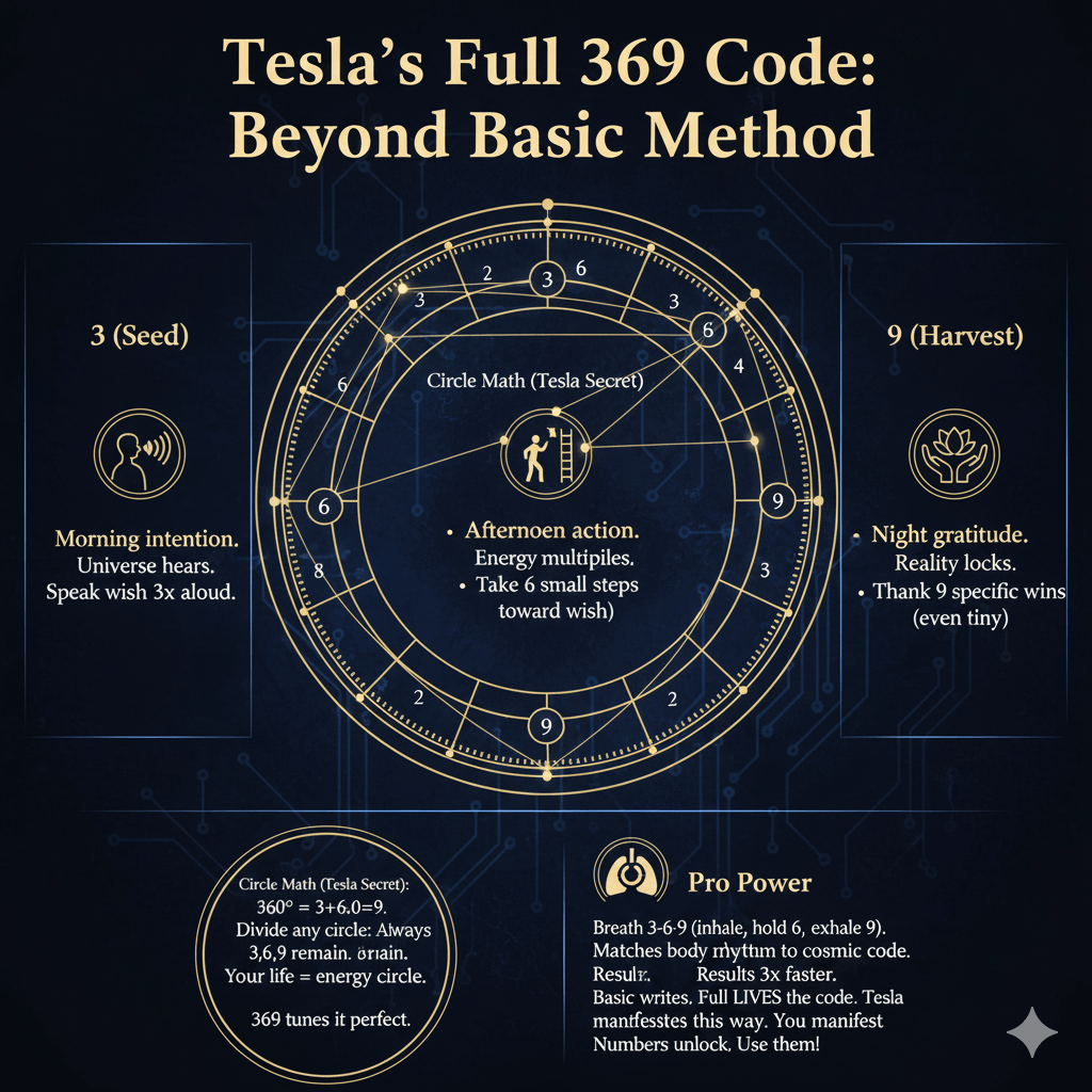 Tesla saw 3-6-9 as universe keys. Not just numbers—vibrational codes. 3 starts energy. 6 balances it. 9 completes cycle. Basic 369 writes wishes. Full code lives it daily.