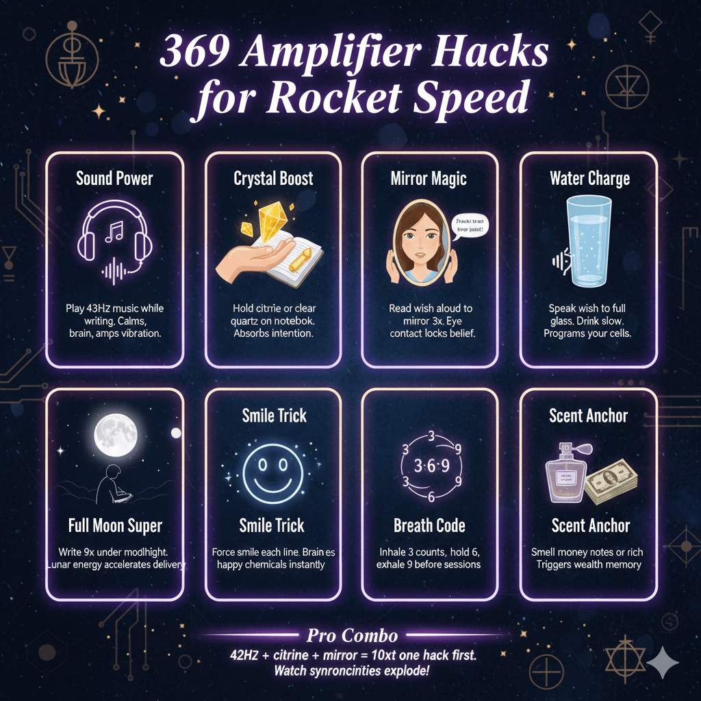 Pro Combo: 432Hz + citrine + mirror = 10x speed. Test one hack first. Watch synchronicities explode!