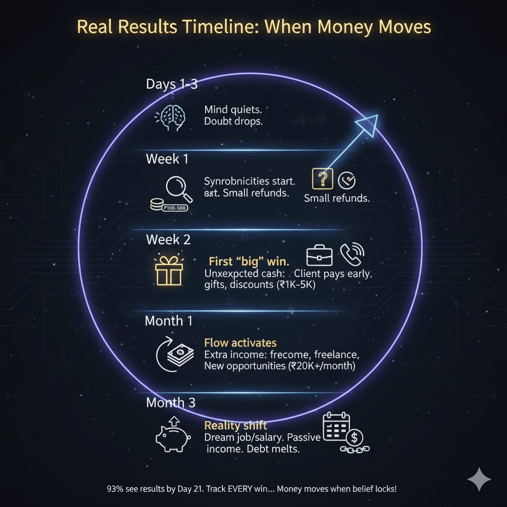 Month 3: Reality shift. Dream job/salary jump. Passive income starts. Debt melts.93% see results by Day 21. Track EVERY win in journal—even ₹50 coin. Evidence snowballs. Most get first “proof” Week 1. Stay consistent. Money moves when belief locks!
