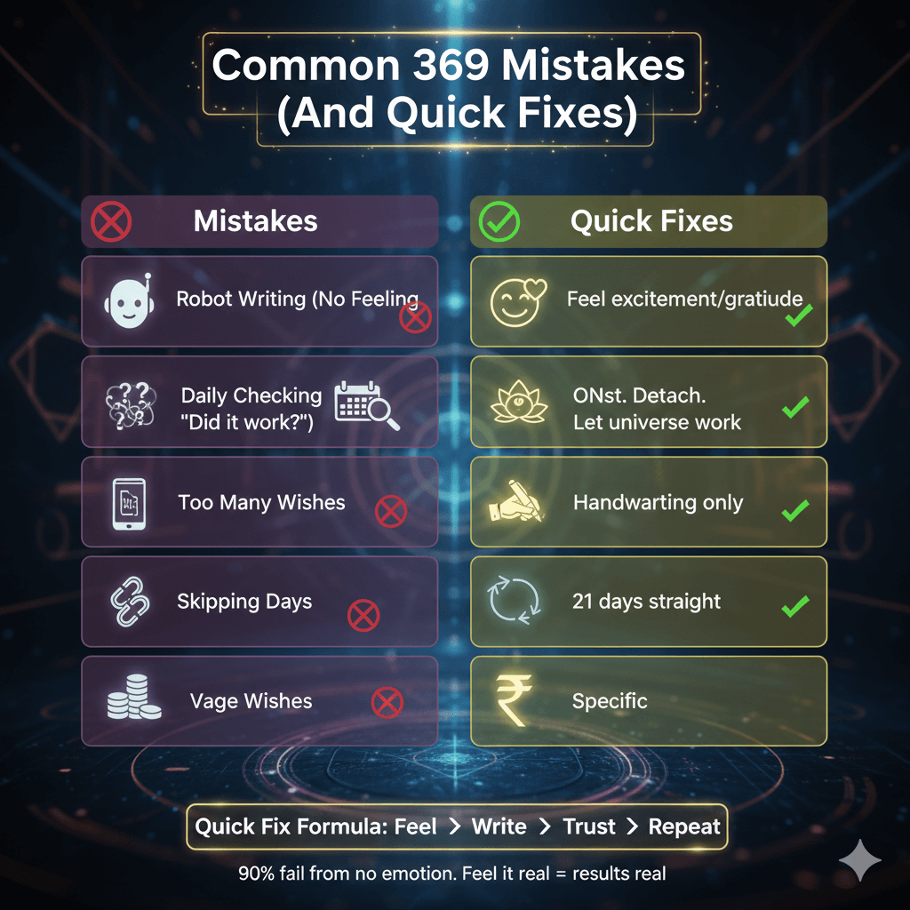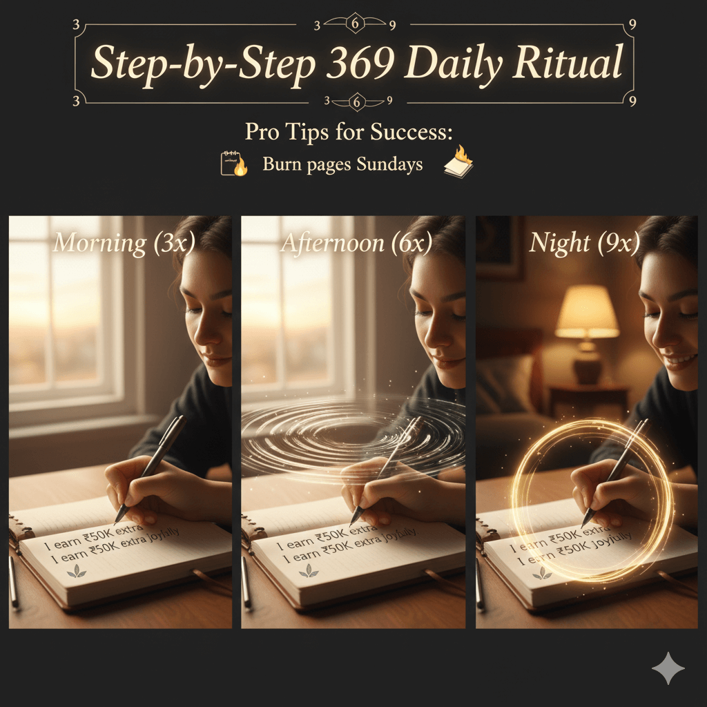Vague wishes bring vague results. Clear wishes create clear paths. Make your 369 sentence sharp like a laser. Use present tense: “I have” not “I want.” Be specific: “₹50,000 extra income monthly” beats “more money.” Add positive feeling: “with joy and ease.” One sentence only. Read it aloud. Does it excite you? Perfect. Doubt creeps in? Rewrite simpler.