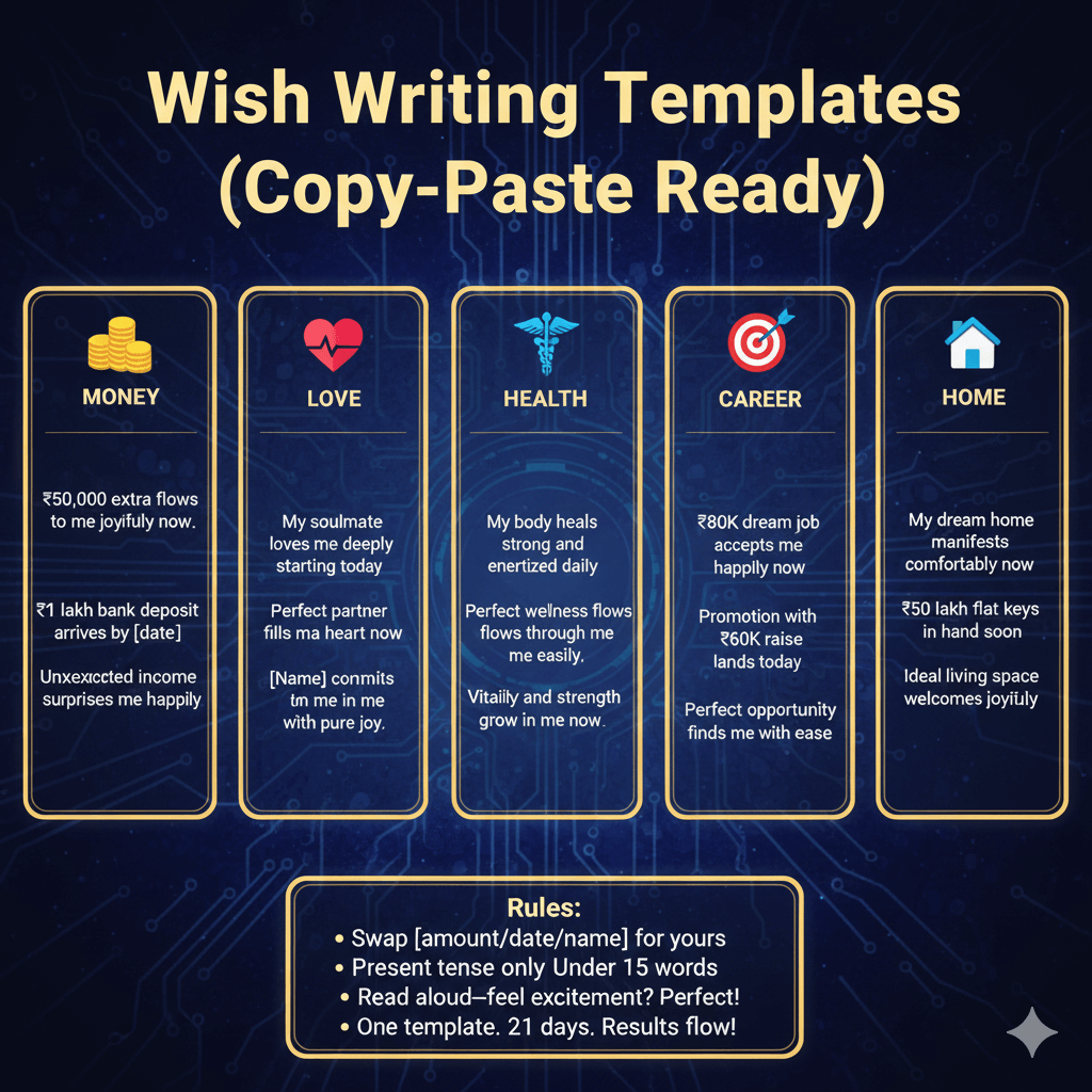 Copy this template. One page per day. Check boxes. Track wins. text Date: ___________ Wish: "______________________________" ☐ MORNING: Wrote 3x (Time: ___) Feeling: Calm/Excited/Doubt ☐ AFTERNOON: Wrote 6x (Time: ___) Synchronicities Today: ________ ☐ NIGHT: Wrote 9x (Time: ___) Gratitude Level (1-10): ___ DAILY WINS (even small): 1. ______________________________ 2. ______________________________ 3. ______________________________ TOMORROW INTENTION: ______________________________ Notes/Dreams: ______________________________ Weekly Review (Sunday): • Total days completed: ___/7 • Biggest win this week: ________________ • Wish adjustment needed? Y/N Why: ________ • Confidence level (1-10): ___ Pro Tips: • Green pen = done sessions • Star ★ = money/love signs • 21 days = print 3 copies • Review snowballs belief Consistency tracked = results locked. Never miss. Manifestation guaranteed!