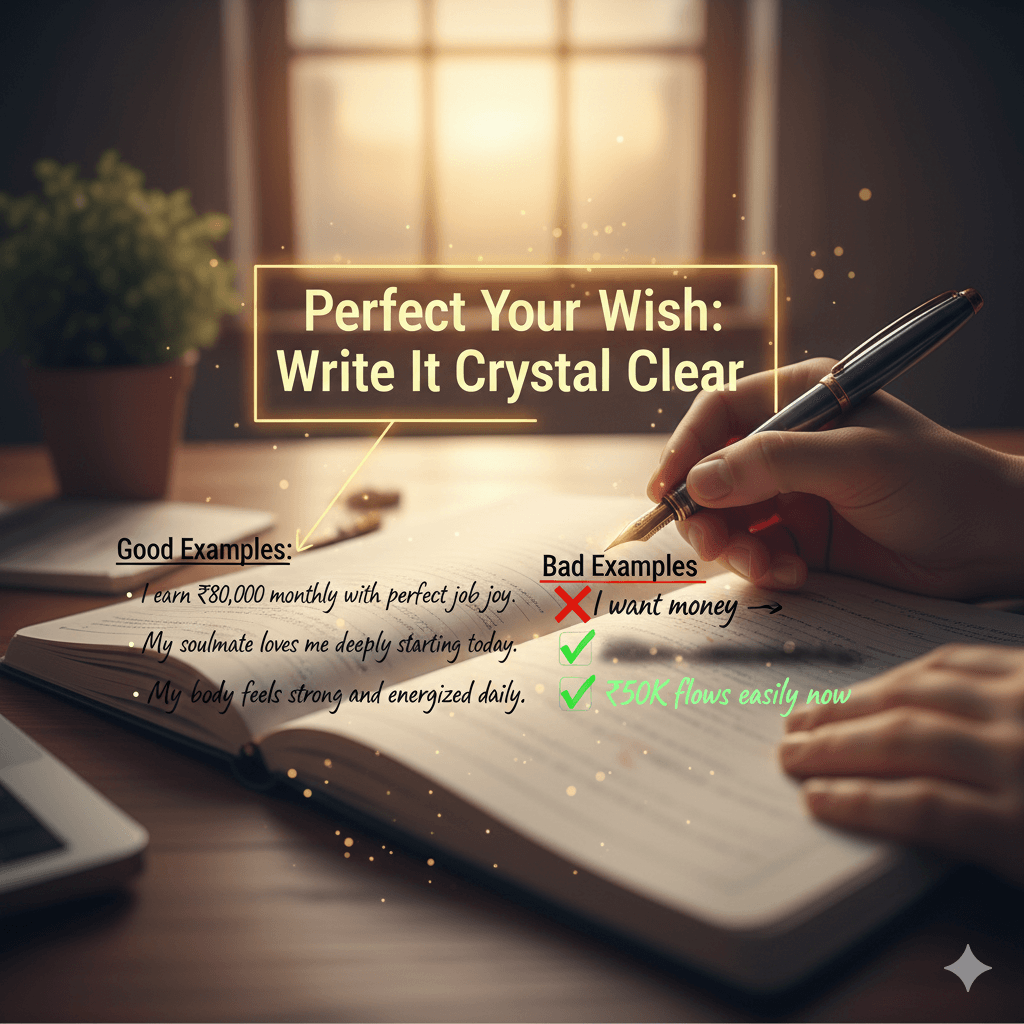 - Mirror Magic: Read wish aloud to mirror 3x after writing. Eye contact locks belief.