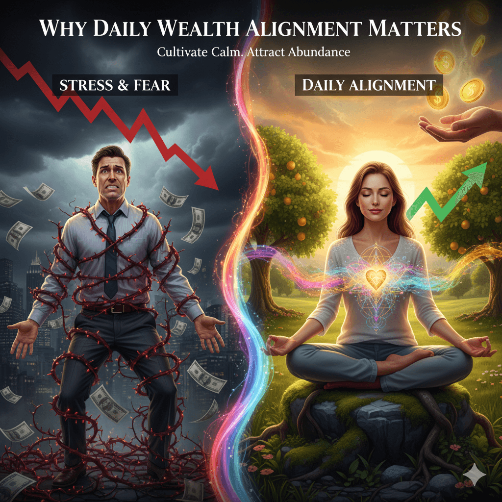 Daily wealth alignment changes this pattern. It trains your mind and body to feel calm, confident, and emotionally safe around money.