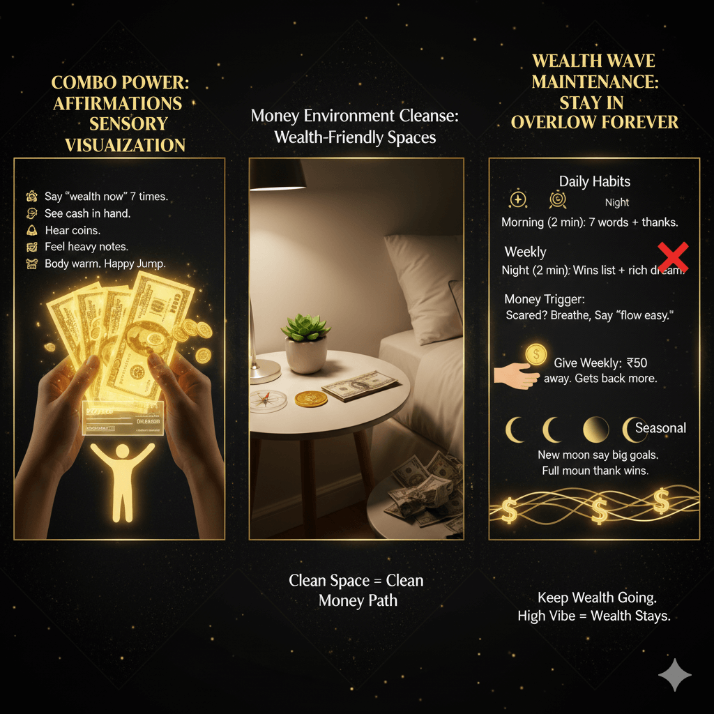 Do morning, lunch, night. Brain mixes real and dream. Brings real cash. Example: See bonus check. Feel happy jump. Money shows up.