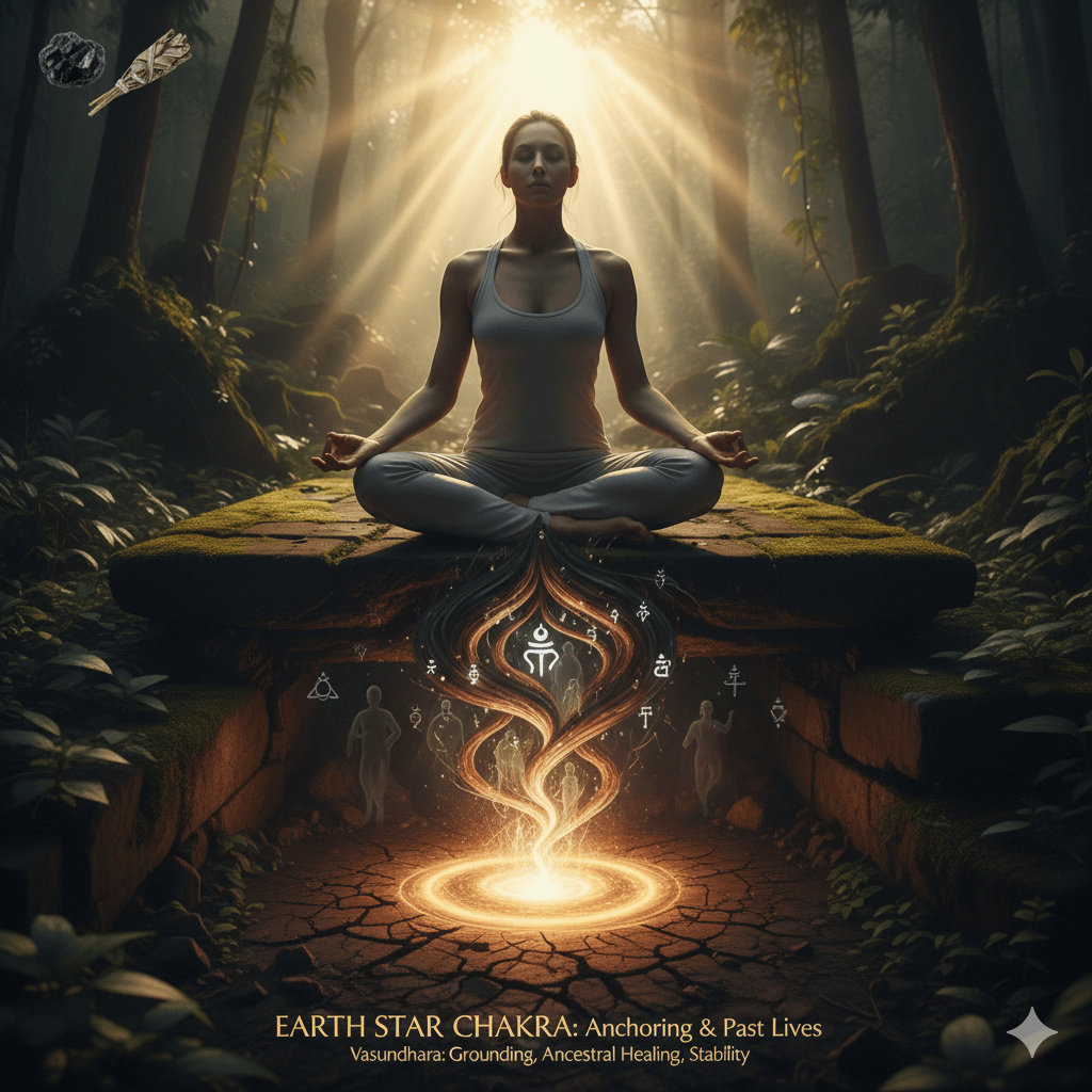 • Earth Star (8th): 12″ below feet, smoky brown/black – anchors to planet, past lives.