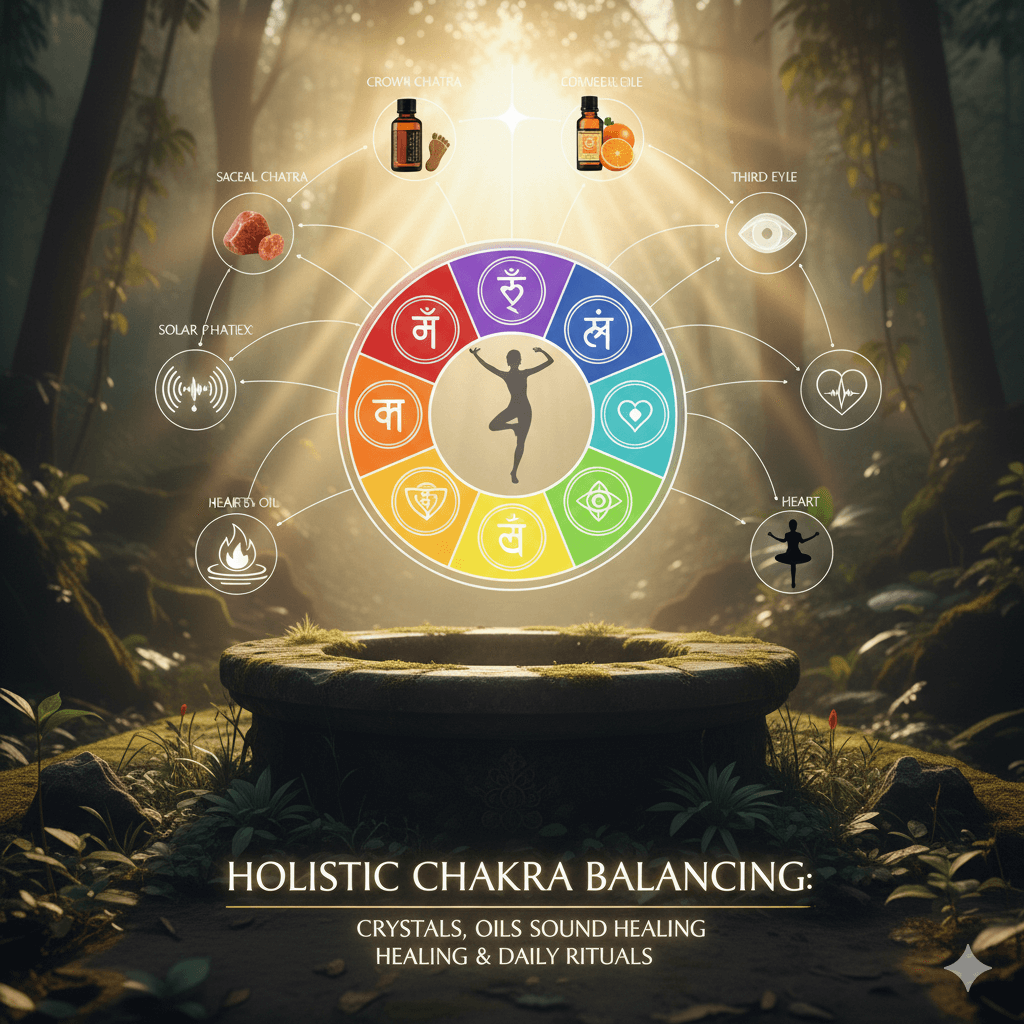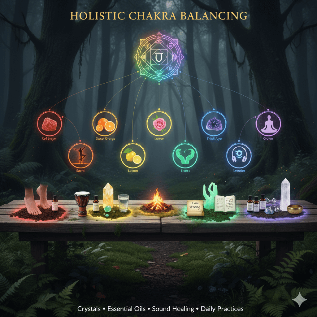 Crystals, essential oils, sound healing, and daily practices offer powerful, accessible ways to balance chakras by aligning their unique vibrations with your energy field. Place crystals on chakra points during meditation, diffuse oils matching each center’s essence, use sound frequencies like singing bowls or mantras to clear blockages, and integrate simple habits for ongoing harmony. These tools work synergistically to restore flow, reduce stress, and enhance well-being.