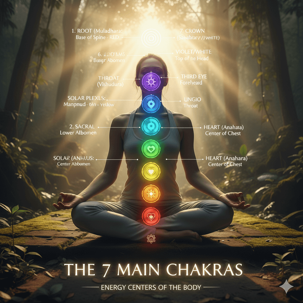 The traditional 7 main chakras form the core energy system in yogic philosophy, each with a unique Sanskrit name, body location, and rainbow color. Running along the spine from base to crown, they regulate physical, emotional, and spiritual health when balanced.