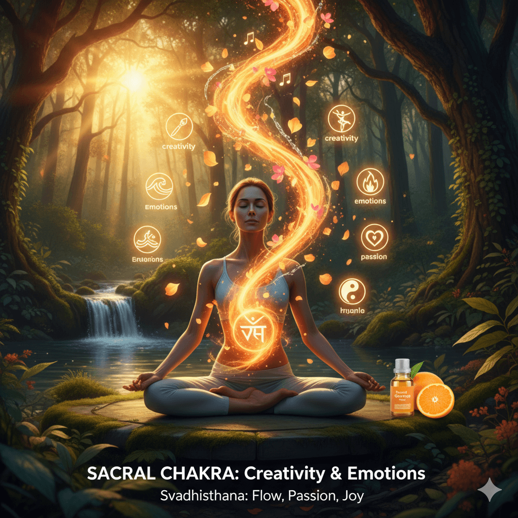 The Sacral Chakra, or Svadhisthana (meaning “one’s own abode”), is the second energy center, located in the lower abdomen just below the navel and above the pubic bone. Associated with the water element and vibrant orange color, it governs creativity, emotions, sensuality, pleasure, and relationships. When balanced, it fosters fluid emotional expression, passion, and joyful connections; when blocked, it leads to emotional instability or creative blocks.