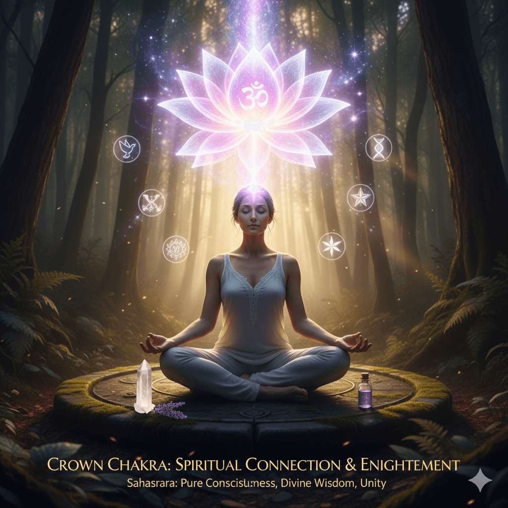 • Crown (7th, Sahasrara): Top of head, violet – divine connection.