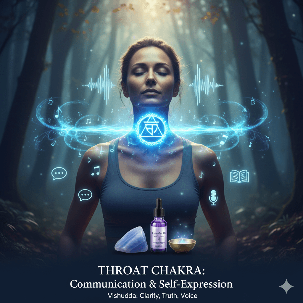 The Throat Chakra, or Vishuddha (meaning “purification”), is the fifth energy center located at the throat, near the larynx, thyroid, and cervical spine. Associated with the ether/space element and vibrant blue color, it governs communication, self-expression, truth, and listening. When balanced, it enables clear, authentic speech and creative articulation; blockages cause difficulty speaking up or feeling unheard.