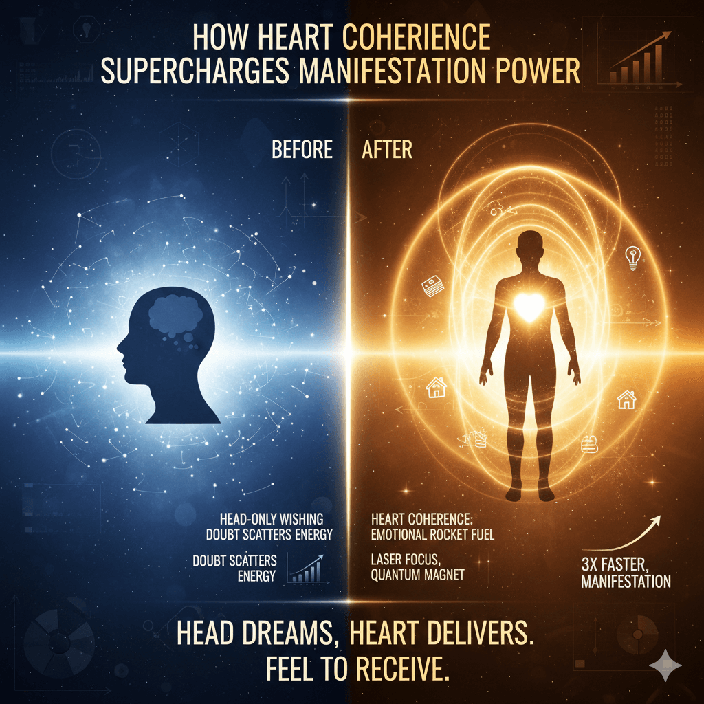 Manifestation fails from head-only wishing—heart coherence adds emotional rocket fuel. Law of Attraction needs feeling; heart generates purest vibes. Coherent state emits 5x stronger field broadcasting desires clearly.