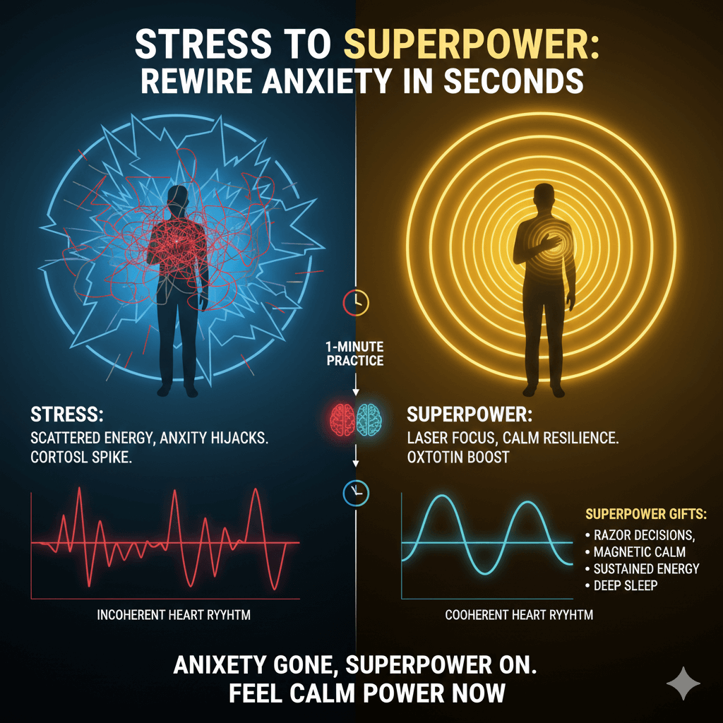 Anxiety hijacks life till heart coherence flips it to strength. Stress scatters heart rhythm; coherence smooths instantly, converting panic to power. HeartMath research: 1-minute practice drops stress hormones 30%, builds resilience.