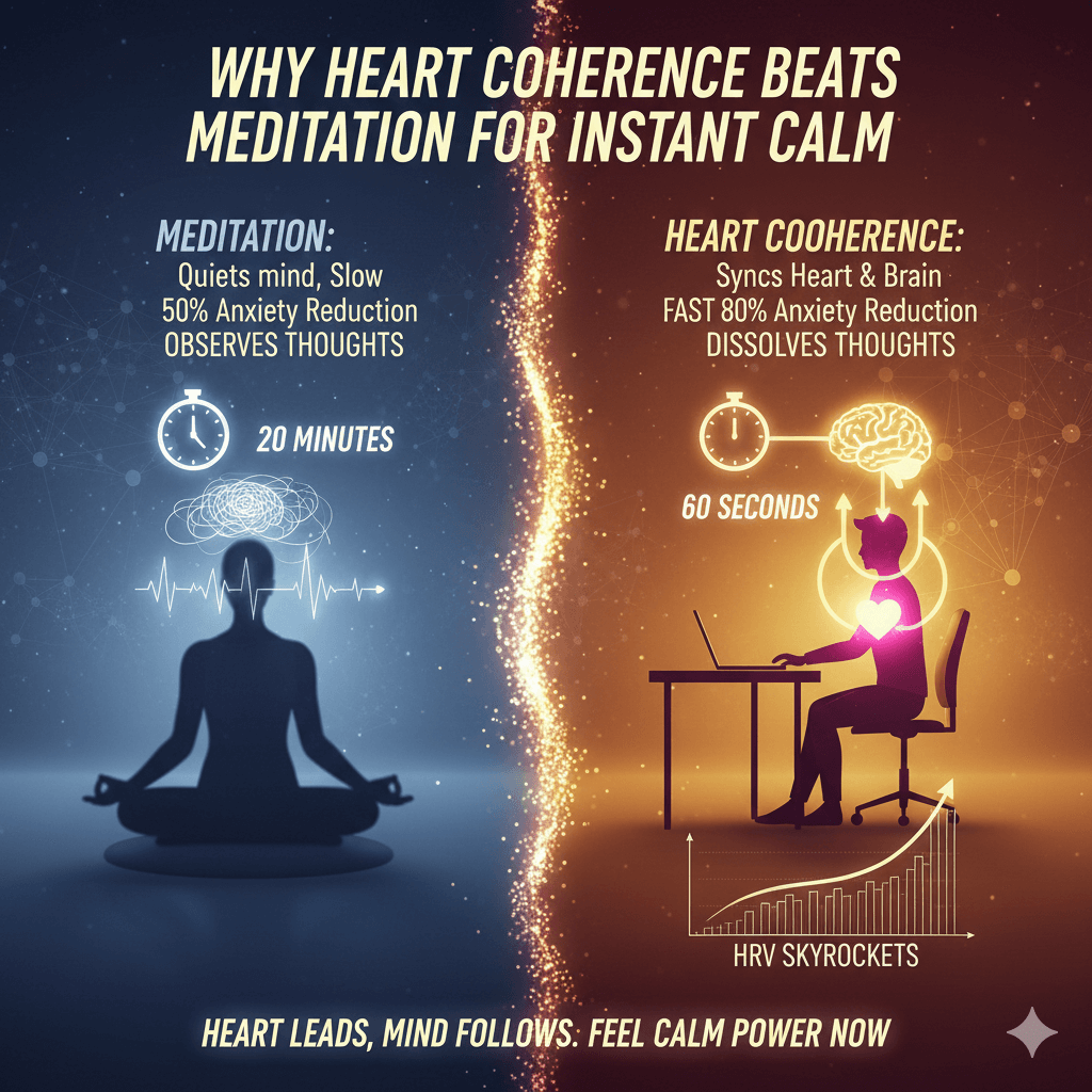 Real difference: Meditation observes thoughts; coherence dissolves them. Heart’s electromagnetic pulse overrides worry circuits, flooding oxytocin (love hormone). Users report 80% anxiety drop vs 50% from meditation after one week.