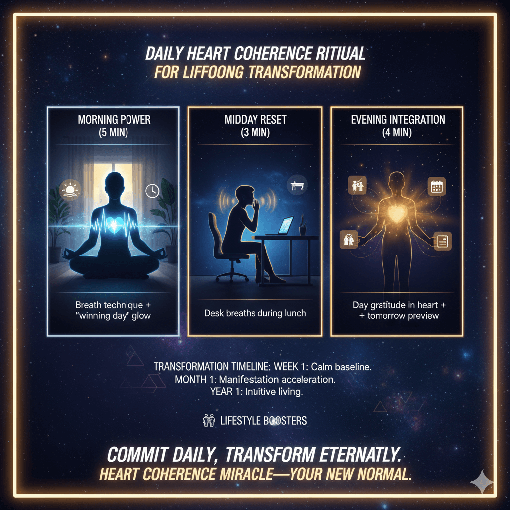 Mastery signs: Stress bounces off, synchronicities constant, body energized. Heart leads every decision perfectly. This ritual = life upgrade OS. Commit daily, transform eternally. Heart coherence miracle—your new normal.