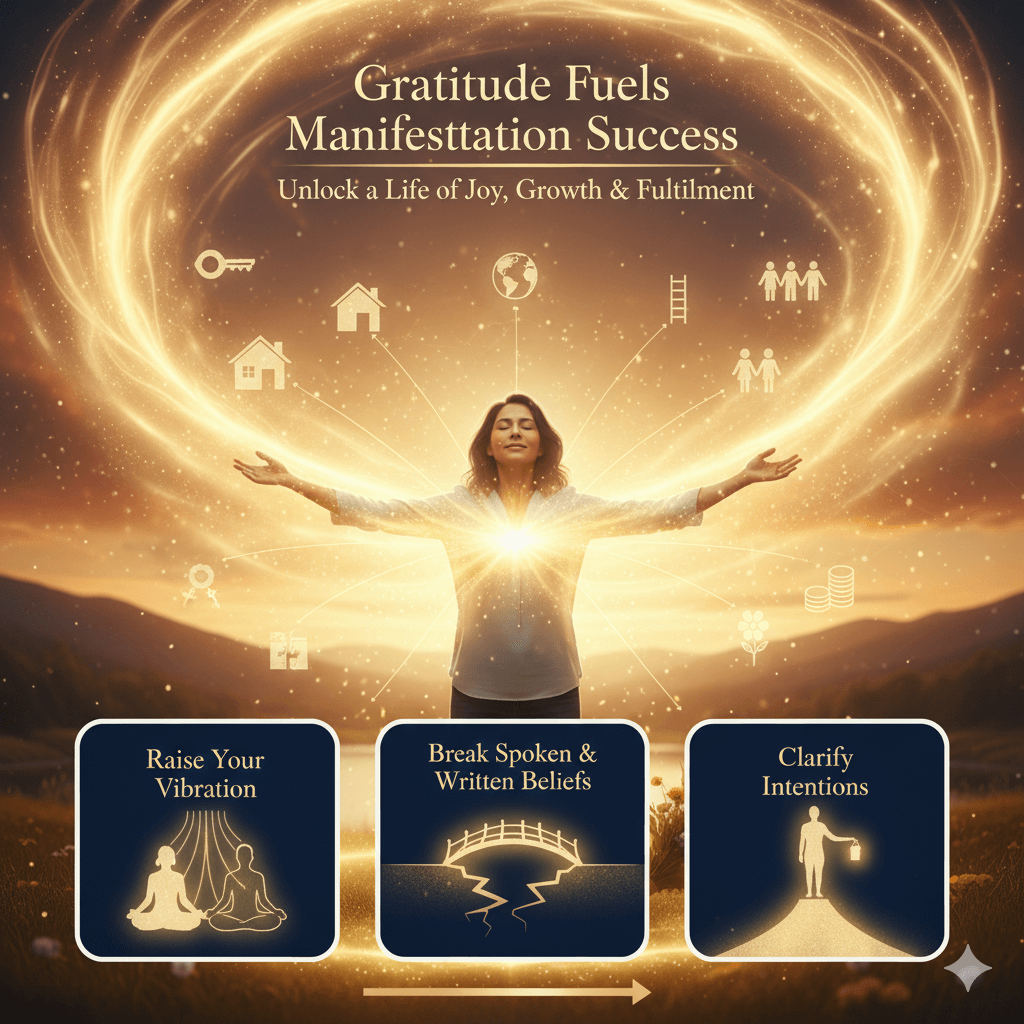 Manifestation is the process of turning your desires into reality through focused thought, belief, and action. Gratitude plays a crucial role by shifting your energy to a positive, abundant state. When you feel thankful, you align with what you want to attract, making manifestation clearer and faster. Gratitude amplifies the power of manifestation by fostering positive mindset and vibrational harmony.