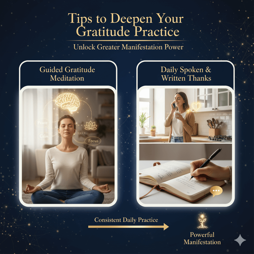 Tips to deepen your gratitude practice for better manifestation include meditation and mindfulness focused on gratitude. Spend a few minutes daily quietly reflecting on things you appreciate, tuning into positive feelings. Also, regularly express gratitude for what you already have, verbally or in writing, to reinforce abundance and attract more positive outcomes into your life.