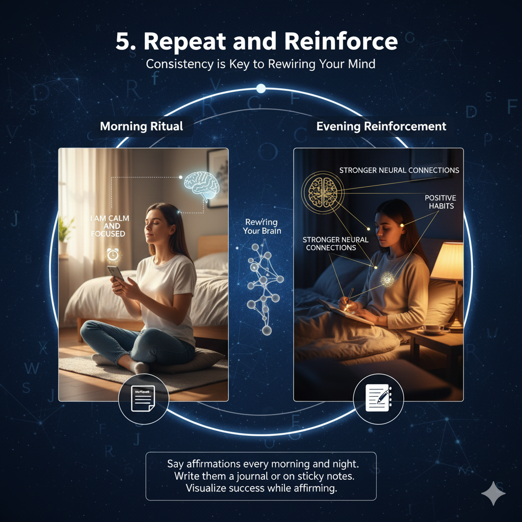 Repetition reinforces belief. Saying affirmations daily, especially in the morning and before bed, helps embed the ideas in your subconscious.