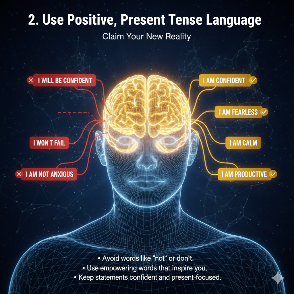 Affirmations should describe what you want as if it is already true. Use “I am” or “I have” instead of future tense or negatives. This trains your brain to accept the new belief.