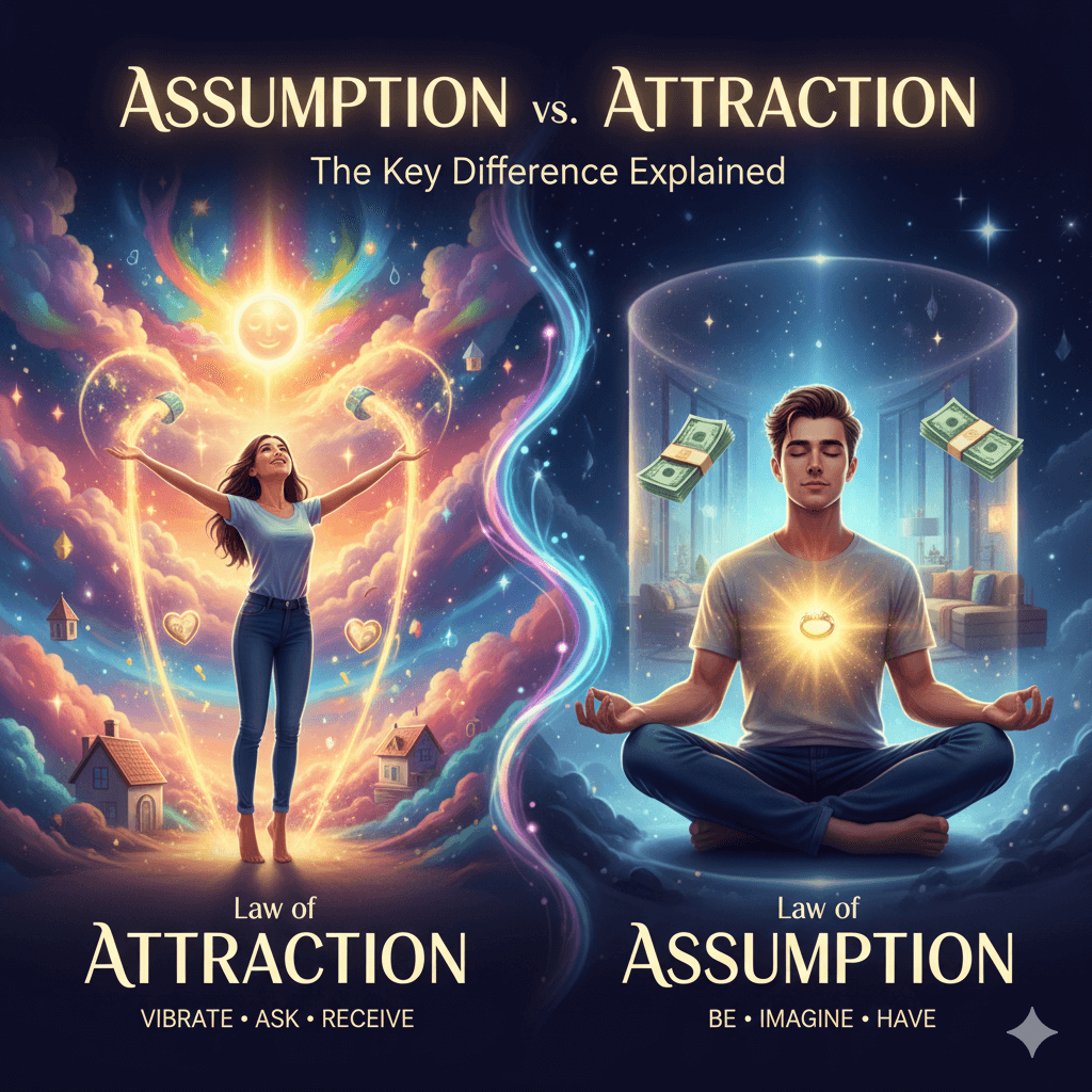 Both ideas say your inner state shapes your outer reality, but they work in different ways. The Law of Attraction focuses on “like attracts like” through thoughts and vibration, while the Law of Assumption focuses on “what you accept as true becomes your experience.” Attraction is about drawing things in; assumption is about inwardly becoming the person who already has it.