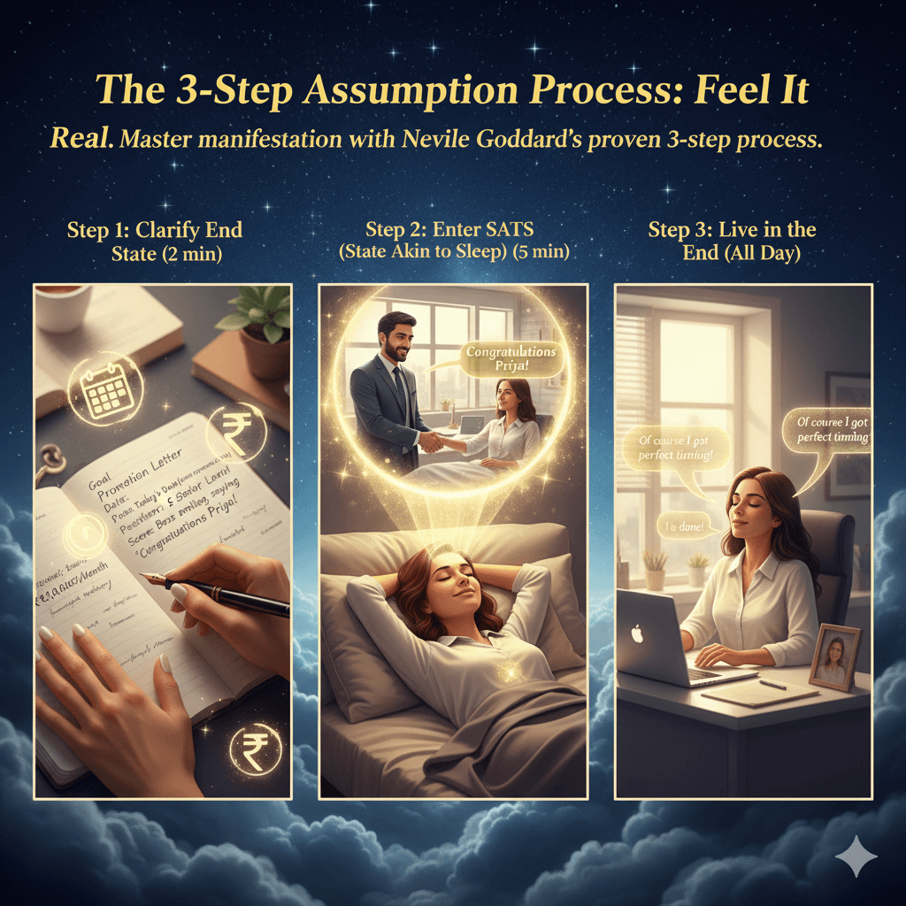 The Law of Assumption reveals your deepest beliefs shape reality stronger than positive thinking alone. Neville Goddard’s powerful teaching: “Live from the end result now.” Priya assumed her promotion was done despite rejections—landed it in 28 days! Simple daily rituals reprogram your subconscious to make the impossible inevitable. Ready to master assumption and transform your life?