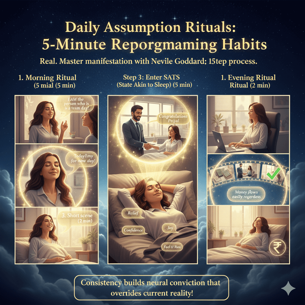 Reprogram your subconscious daily with these simple 5-minute rituals. Morning sets assumption tone, evening reinforces during sleep. Consistency builds neural conviction that overrides current reality.