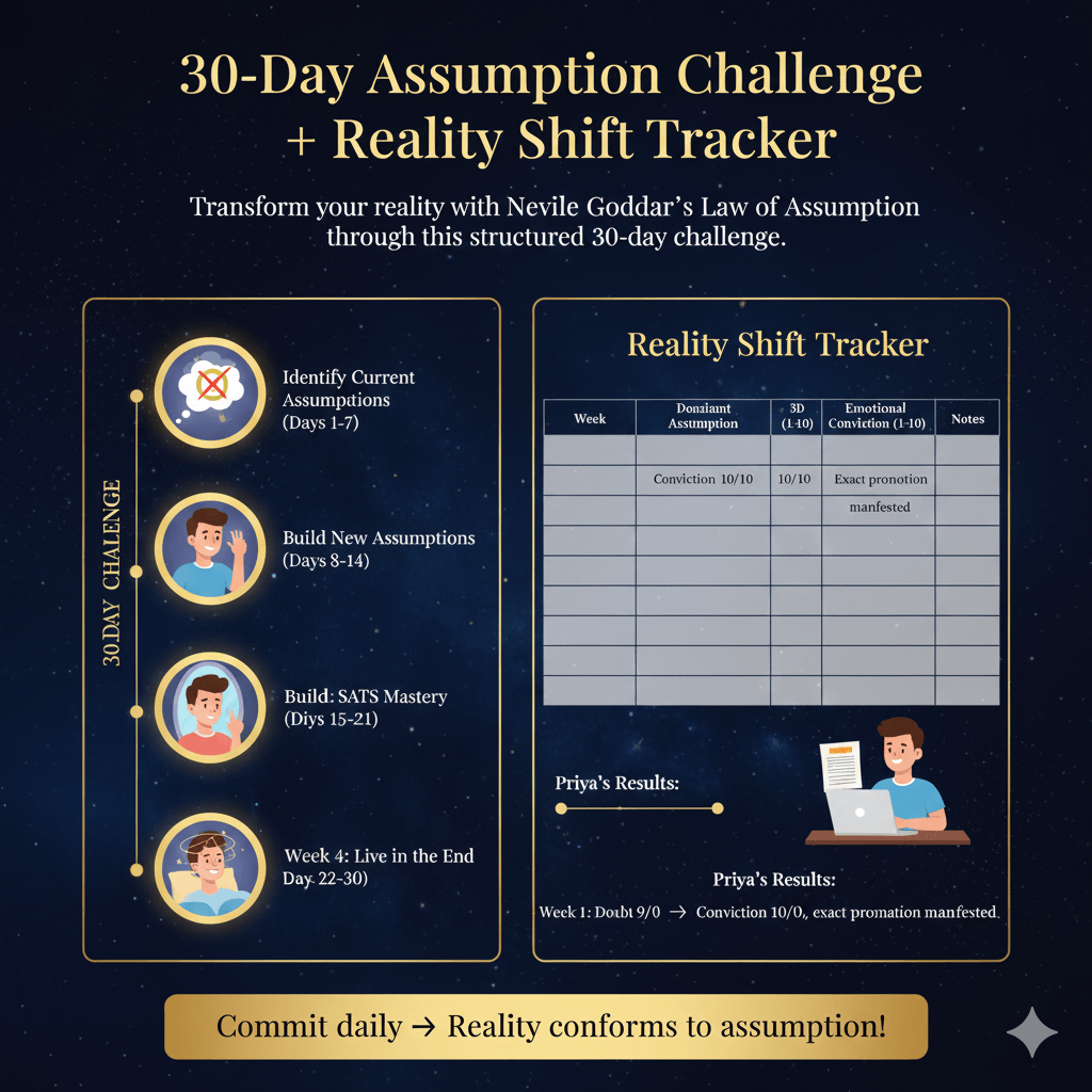 Transform your reality with Neville Goddard’s Law of Assumption through this structured 30-day challenge. Each week builds assumption mastery—from identifying blocks to living fully in the end state. Daily 5-minute rituals + weekly tracking create permanent subconscious shifts.