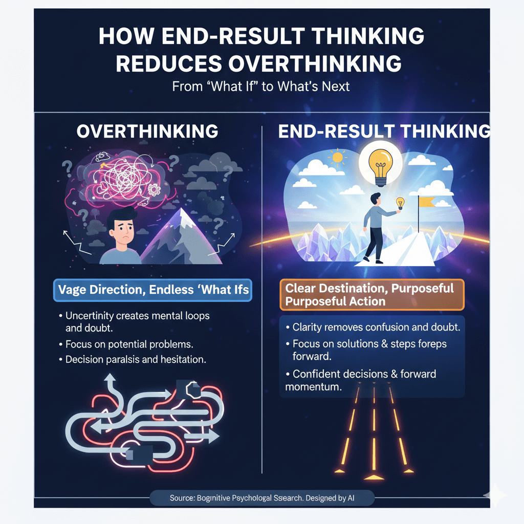End-result thinking reduces overthinking by giving the mind a clear destination. When you focus on the final outcome as already possible, the brain stops analyzing endless “what if” situations. Overthinking usually happens when the mind is unsure about direction. A clear end result removes confusion and provides certainty. This helps you make decisions faster and with less emotional pressure. Instead of worrying about every small step, you begin to trust the process and move forward. End-result thinking does not ignore planning—it simply prevents unnecessary mental loops. With clarity about the outcome, your attention shifts from doubt to purposeful action.
