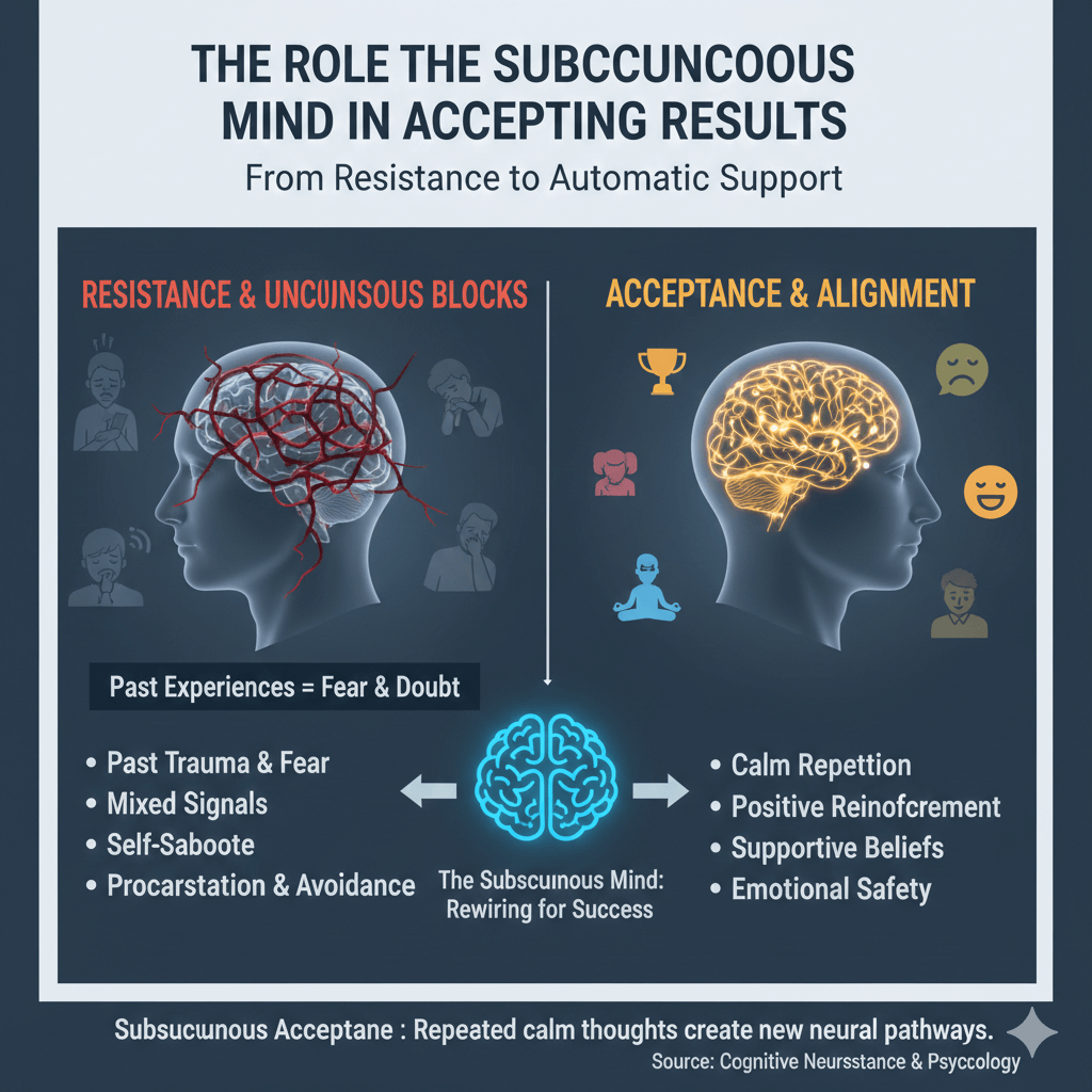 The subconscious mind plays a major role in whether you accept or resist your desired results. It stores your past experiences, beliefs, and emotional memories. If the subconscious associates success with stress, fear, or pressure, it may create hesitation even when you consciously want progress. When new ideas or goals are repeated with calm emotion, the subconscious slowly accepts them as safe and possible. This acceptance reduces inner resistance and makes action feel natural. The subconscious does not respond to words alone—it responds to repeated thoughts, feelings, and experiences. Once it accepts a result as normal, your behavior begins to support it automatically.