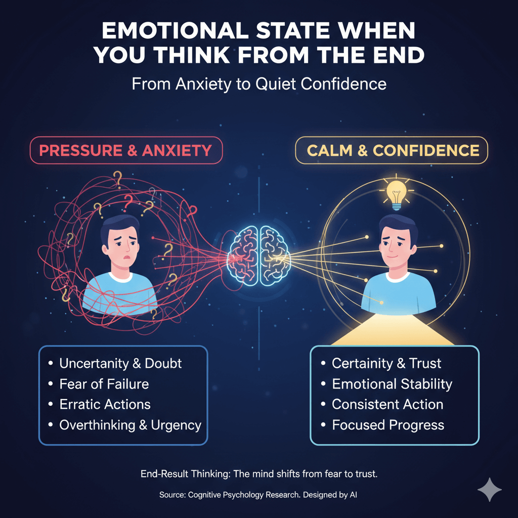 When you think from the end result, your emotional state naturally becomes calmer and more confident. Instead of feeling pressure about how things will happen, you begin to feel a quiet sense of certainty. This reduces anxiety, doubt, and urgency. The mind shifts from fear to trust, which makes decisions easier. When emotions are stable, actions feel lighter and more consistent. Thinking from the end does not mean ignoring effort—it means working with a mindset that the result is possible and safe. This emotional stability helps you stay focused, avoid overreactions, and maintain steady progress toward your goal.