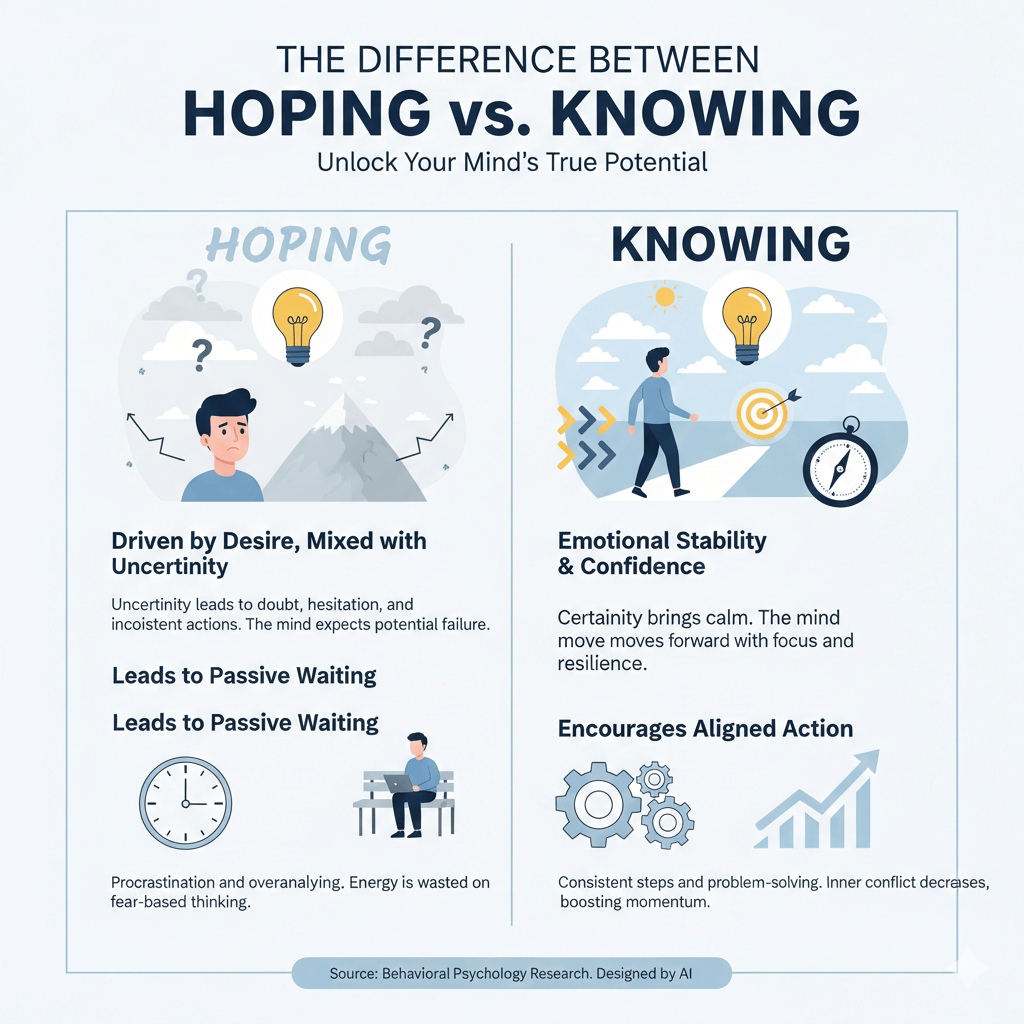 When you hope for an outcome, part of your mind still expects failure or delay. This mixed signal creates hesitation and reduces confidence. Actions become inconsistent because the brain is unsure whether to fully commit or stay protected from disappointment. - Knowing creates emotional stability and confidence
