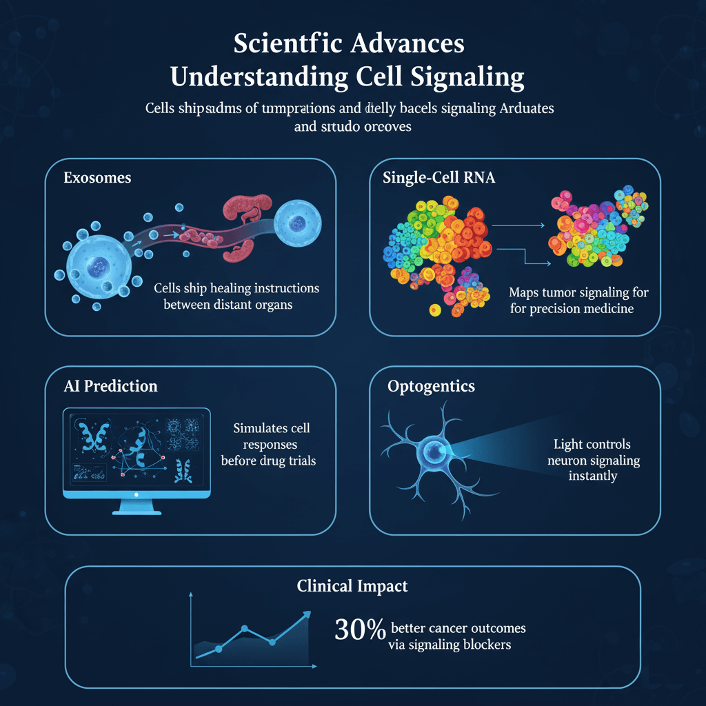 Recent breakthroughs reveal cells communicate via exosomes (tiny vesicles carrying RNA/proteins), gap junctions (direct electrical links), and tunneling nanotubes (physical bridges between cells). Single-cell RNA sequencing maps real-time signaling in tumors, guiding targeted cancer therapies. AI algorithms now predict signaling cascades from protein data, accelerating drug discovery. Optogenetics uses light to control cell signals precisely, revolutionizing neuroscience. These advances confirm mind influences signaling via stress hormones and epigenetics, validating cellular communication practices.