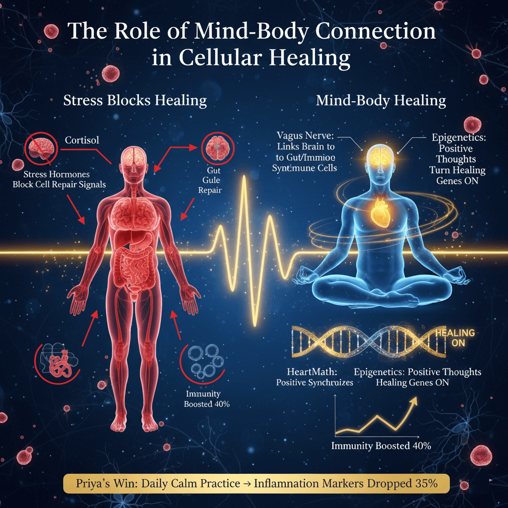Your mind directly influences cellular healing through the nervous system—stress triggers cortisol blocking repair signals, while calm thoughts release healing chemicals like endorphins and oxytocin. The vagus nerve links brain to cells, activating parasympathetic “rest and digest” mode for optimal repair. Positive emotions optimize epigenetics, turning healing genes ON. HeartMath research shows focused positive emotion synchronizes heart-brain-cell communication, boosting immunity 40%. Priya reduced chronic inflammation via daily calm visualization.