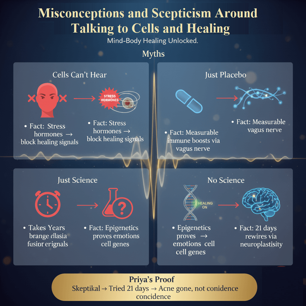 Many dismiss cellular communication as “woo-woo” pseudoscience, but it leverages proven mind-body mechanisms science validates. Misconception: “Cells don’t hear thoughts”—true, but stress hormones from negative thinking block repair signals, while calm focus releases healing chemicals. Skeptics ignore epigenetics showing emotions alter gene expression. Placebo studies prove belief alone heals via optimized signaling. Not magic—influencing autonomic nervous system like biofeedback does. Priya’s skin cleared because relaxation optimized cell repair, not mysticism.