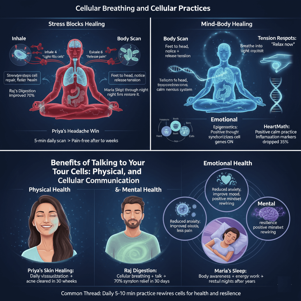 Cellular breathing sends oxygen and healing energy to every cell through slow, deep breaths—inhale for 4 counts visualizing light filling your body, exhale tension for 6 counts. Body awareness practices scan from toes to head, noticing sensations without judgment, releasing stored stress. Combined, they activate parasympathetic healing state, improving circulation and cell repair. Priya practiced daily → chronic headaches gone in 14 days.