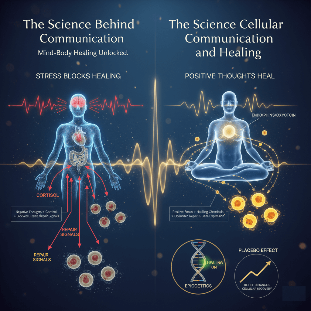 Cells communicate constantly through chemical signals, hormones, and electrical impulses, coordinating healing and growth. Your mind influences this via the nervous system and stress hormones—cortisol from negative thoughts blocks repair signals, while positive focus releases healing chemicals like endorphins. Epigenetics shows emotions alter gene expression in cells without changing DNA. Studies confirm visualization and affirmations improve immune response and tissue repair by optimizing natural cell signaling pathways.