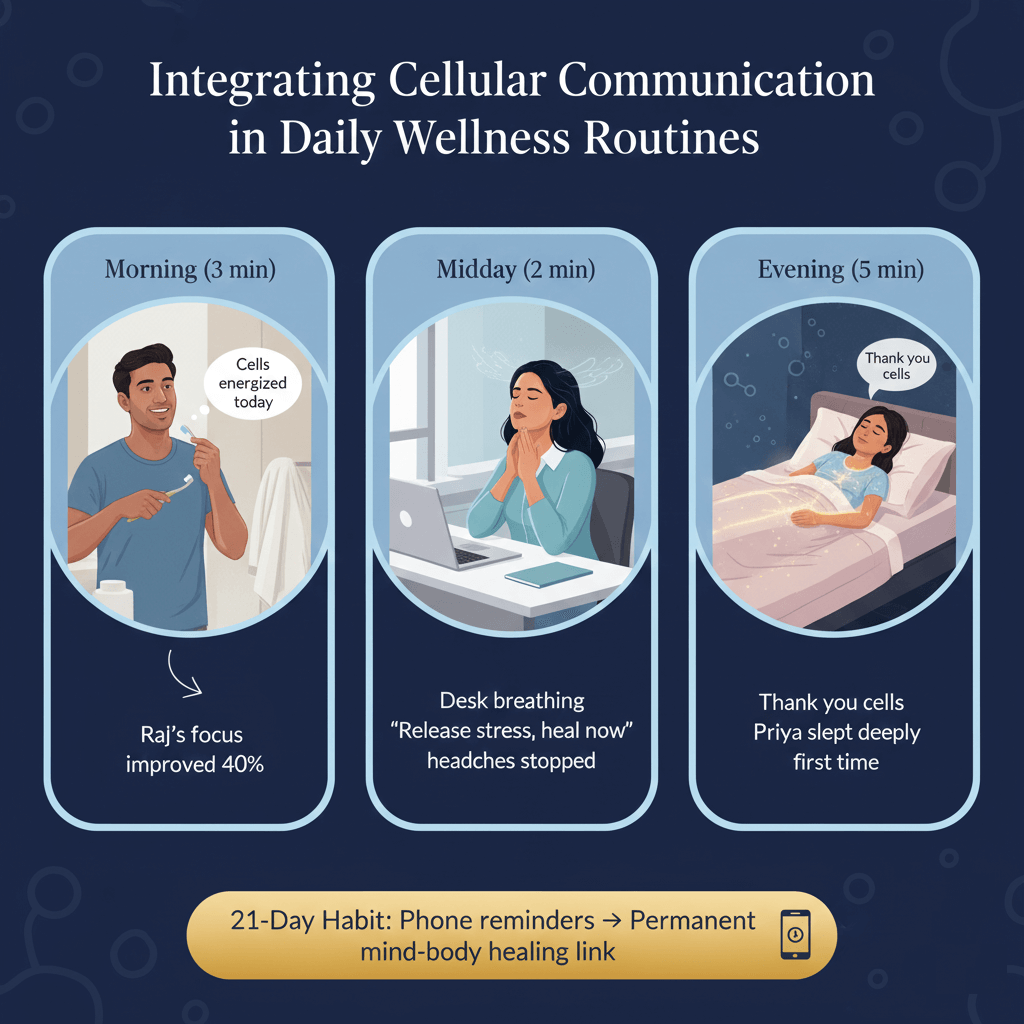 Add cellular talk to your routine easily—morning affirmations while brushing teeth, visualization during coffee breaks, evening body scans before bed. Morning sets healing intention for cells all day. Midday breathing resets stress signals. Night releases day’s tension, promoting overnight repair. Consistency rewires brain-cells connection in 21 days. Priya integrated 5-min practices → chronic fatigue gone, energy tripled. Start small, build habit.
