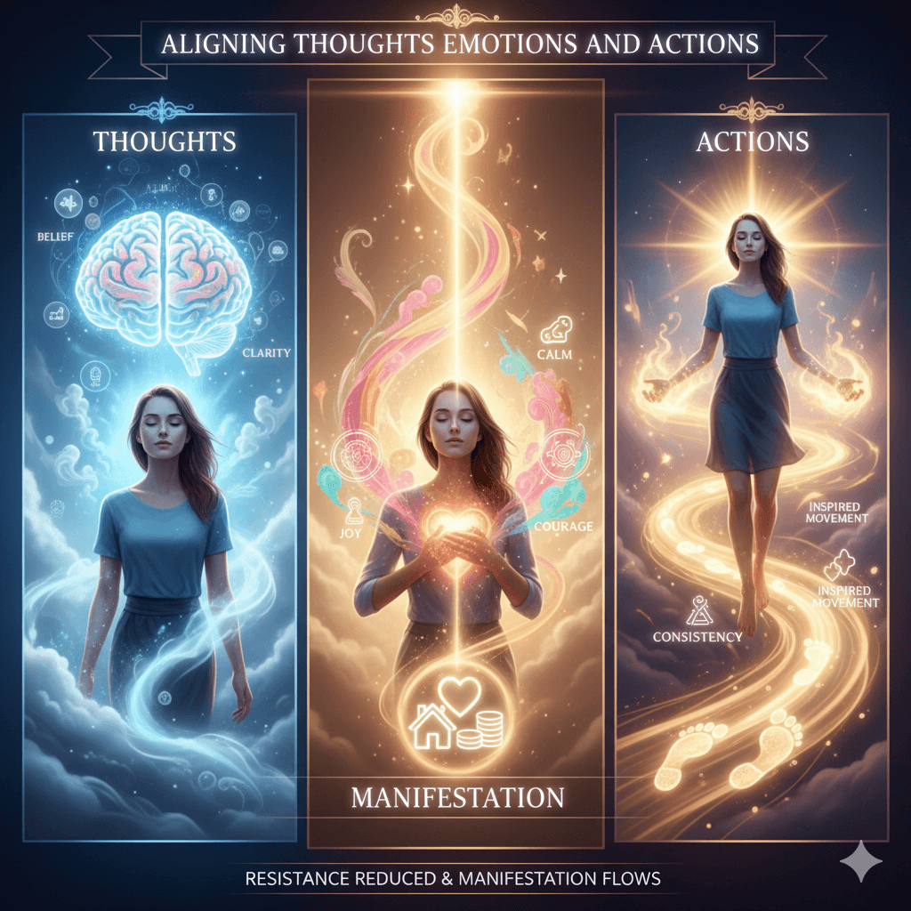 Manifestation requires alignment between thoughts, emotions, and actions. When these are misaligned, progress feels forced. Trauma often causes positive thoughts to conflict with fearful emotions.