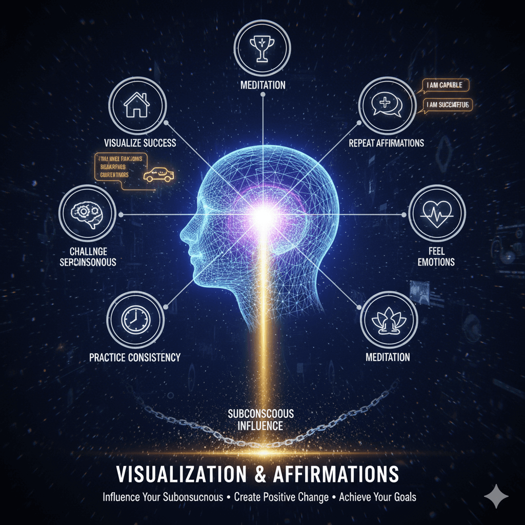 Visualization and affirmations are effective tools to influence your subconscious mind and create positive change. Visualization involves imagining your goals and desired outcomes vividly, engaging all your senses. Affirmations are positive statements repeated regularly to reprogram limiting beliefs. Together, they help align your subconscious with your conscious intentions for success and growth.