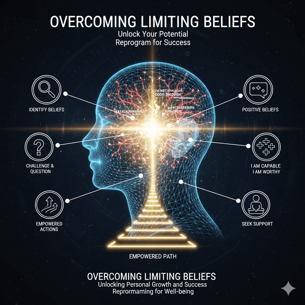 Limiting beliefs are negative thoughts deeply embedded in the subconscious that hold you back from reaching your potential. These beliefs often develop from past experiences, fear, or societal conditioning. Overcoming them is key to unlocking personal growth and success.
