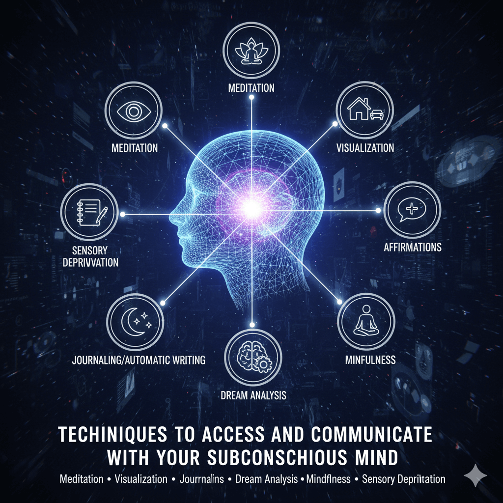 Techniques to access and communicate with your subconscious mind involve practices that quiet the conscious mind, allowing deeper subconscious processes to surface. Here are key methods: