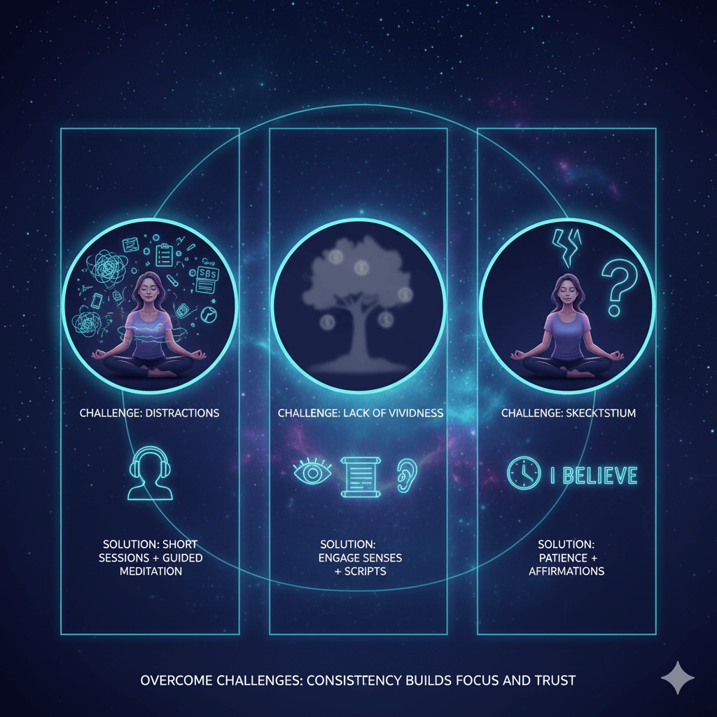 Many beginners struggle with distractions, difficulty imagining vividly, or skepticism about results. To overcome this, start with short sessions, gradually increasing duration. Use guided visualizations or scripts for structure. Address doubts by practicing patience and reinforcing belief with affirmations. Regular practice enhances focus, vividness, and trust in the process, making visualization more effective over time.
