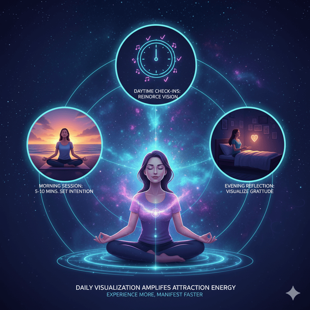 Begin each day with a brief visualization session focusing on your main goal. Imagine achieving it in detail, engage your emotions positively, and hold this vision for 5-10 minutes. Throughout the day, take short mental “check-ins” to reinforce this image. End your day by visualizing gratitude for manifesting your desires. Regular practice amplifies attraction energy effectively.