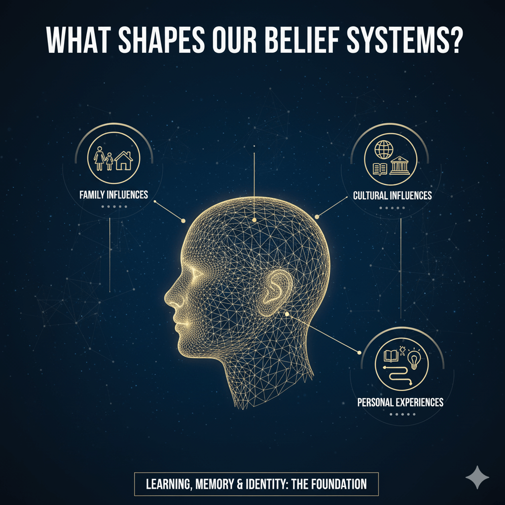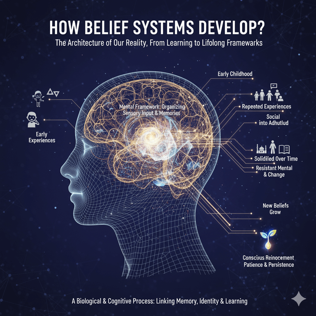 Belief systems develop through a gradual process that begins in early childhood and continues into adulthood. They form as the brain organizes sensory input and memories, creating a mental framework to interpret the world. Over time, repeated experiences and social influences solidify these beliefs, making them deeply ingrained and resistant to change. New beliefs grow by consciously introducing and reinforcing different thoughts, which gradually reshape existing mental patterns through patience and persistence. This process is both biological and cognitive, linking memory, identity, and learning.