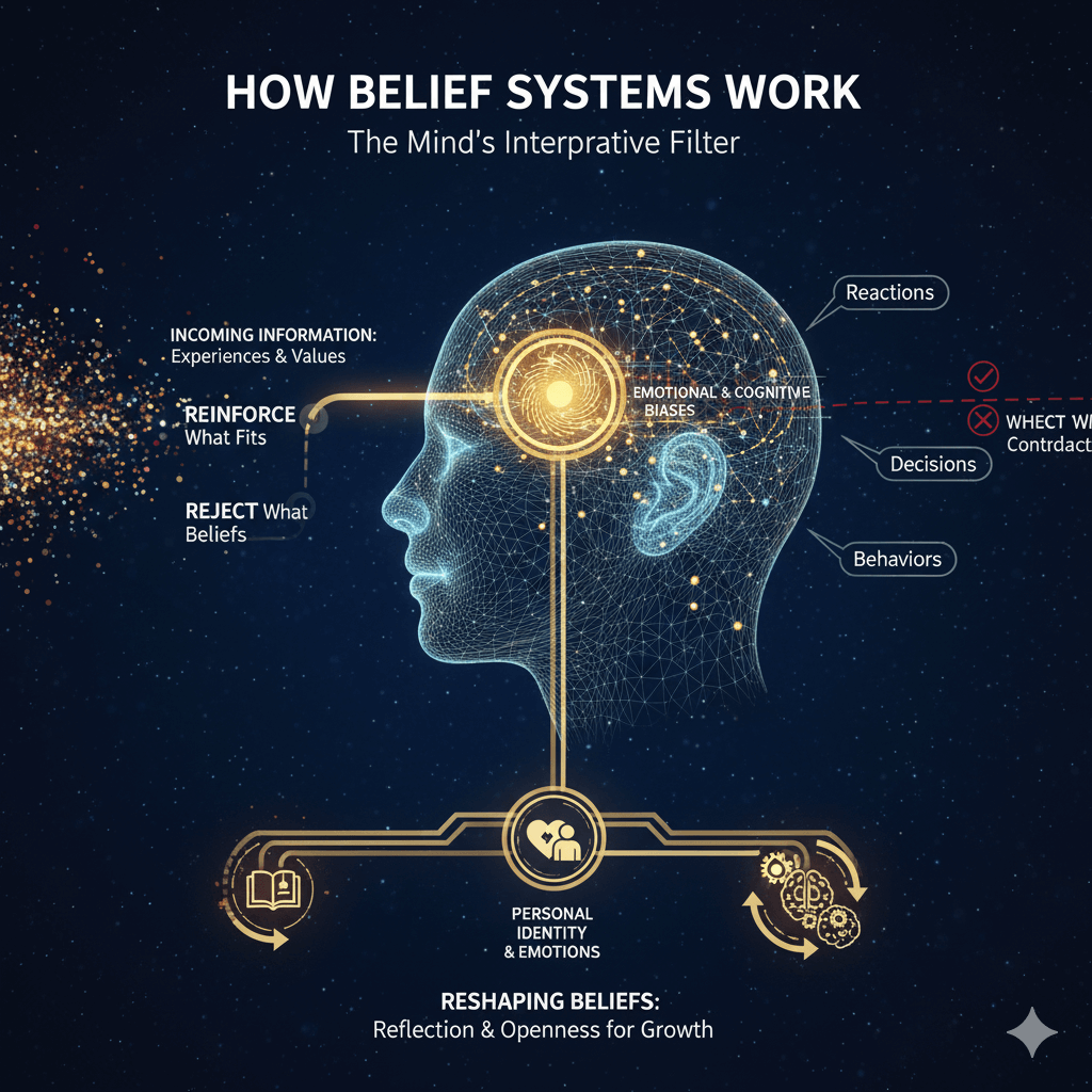 Belief systems work by shaping how we interpret the world based on learned experiences and core values. They filter incoming information through emotional and cognitive biases, reinforcing what fits our beliefs and rejecting what doesn’t. This filtering influences our reactions, decisions, and behaviors. Strong beliefs connect deeply with personal identity and emotions, making them resistant to change, but repeated reflection and openness can help reshape them for personal growth and better decision-making.